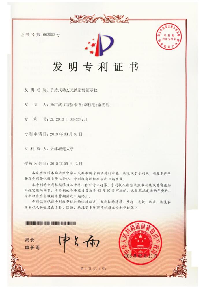 附件:《手持式动态光波衍射演示仪》发明专利证书
